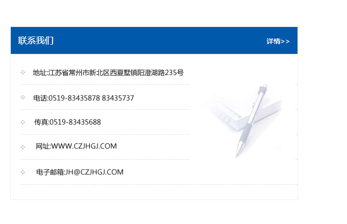 地址:常州市新北區友邦商務大廈1幢16、17層  電話:0519-85101652  傳真:0519-85112595  郵編:213022  網址:www.cz-jiayue_cn.csydsp.com  郵箱:xiajifengaa@163.com